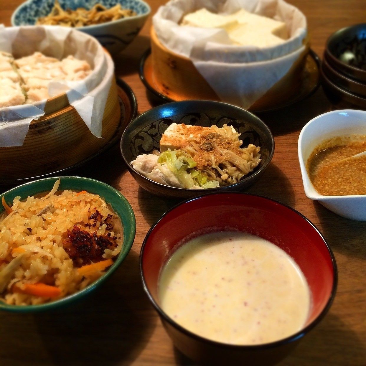 こちらは野口ゆかさんのほったらかしセイロレシピです。作り方は、白ネギの上に鶏胸肉をのせたものと豆腐をセイロで蒸すだけ。常備菜のきのこソテーをのせ、好みのタレをかけたらできがりです。野口さんは、白すりごま+万能だし醤油、ポン酢+ゆず胡椒の2種類のタレを用意しました。セイロで蒸した豆腐の食感がたまらないそうですよ。