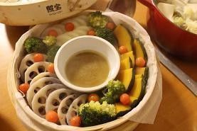 にいかわみかさんによる、セイロを使ったバーニャカウダ。切った野菜を並べて沸騰した鍋にセイロをセットすれば、あとはほったらかしでOK。市販のソースをつけて楽しみます。セイロで野菜を蒸すと、甘みや香りが増しておいしくなるそう。生野菜よりたくさん食べられ、栄養分が溶け出ず、油も不要でカロリーダウンと、いいことづくめですね。