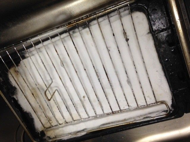 長井さんはさらに、グリルの掃除にも重曹を使ってみました。まず全体に重曹をふりかけ、20分ほど放置。あとは、重曹をペースト状にするように水を加えながら指で軽くこすり、水で洗い流すだけ。網はクシャッとしたアルミホイルで磨くと、さらに効果的なようです。汚れが残りがちな細かい部分は、古歯ブラシを使って磨くのもよさそうですね!