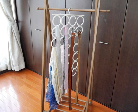 「巻くのが面倒」「収納ボックスの置き場に困る」という人は、ベルトやネクタイ、スカーフをまとめて掛けられるハンガーを活用しましょう。この方法なら疲れて帰ったあとでも手間をかけずに収納できますし、クローゼットの中で邪魔にならない点もうれしいですね。