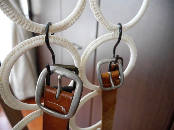 ベルトも写真のように巻いて収納すると場所を取らずすっきり! これならベルトどうしが絡まり合うこともなく、使うときは目当てのものをサッと取り出せます。