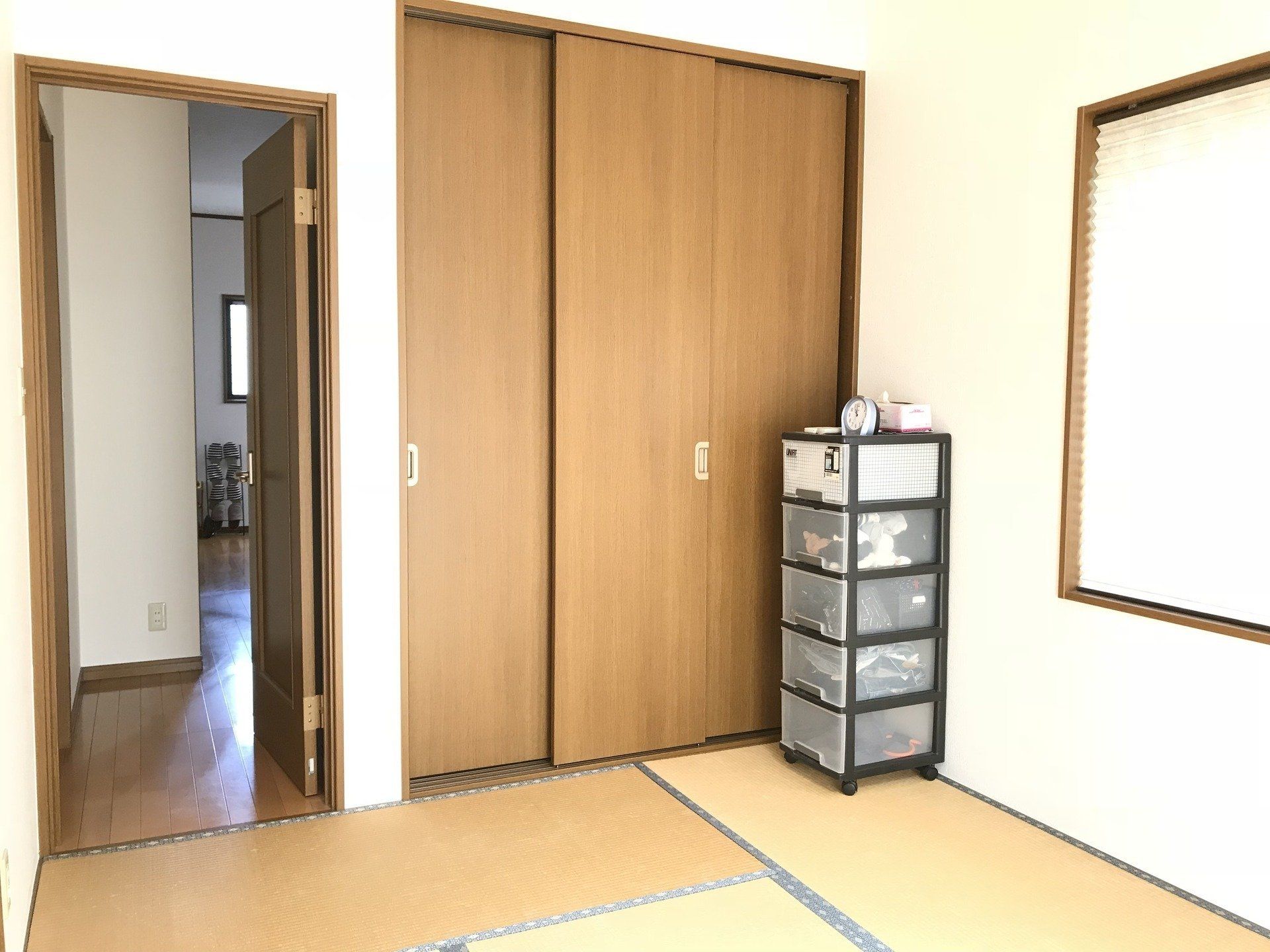 和室には、あえてなにも置かないようにしている海老原さん。この和室は、日中は子どもたちがのびのびと遊べる遊び場として、夜は布団を敷いて寝室として活用しているそうです。押入れには布団や子どもの衣類などを上手に収納しています。なにもないから、ものが倒れてくる心配もなく、防災面でも安心ですね。