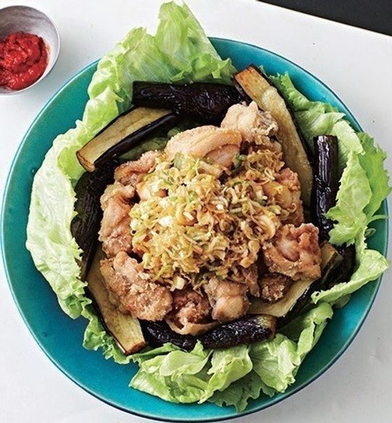1 のねぎを入れたボウルに、ねぎソースの調味料を加えて混ぜる。レタスを器に敷き、なす、鶏肉を盛り、ねぎソースをかける。好みで豆板醤を添える。