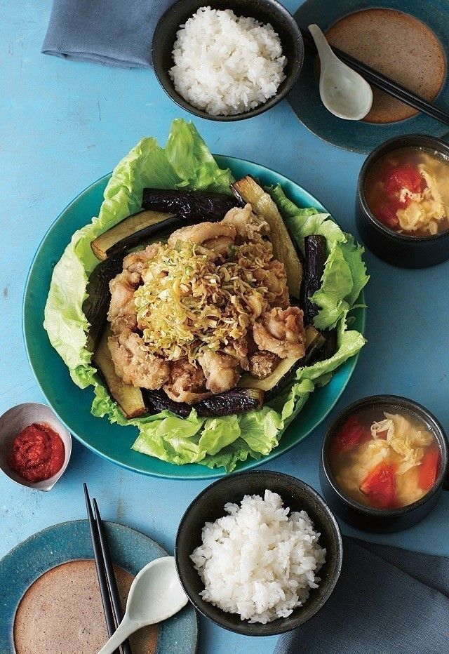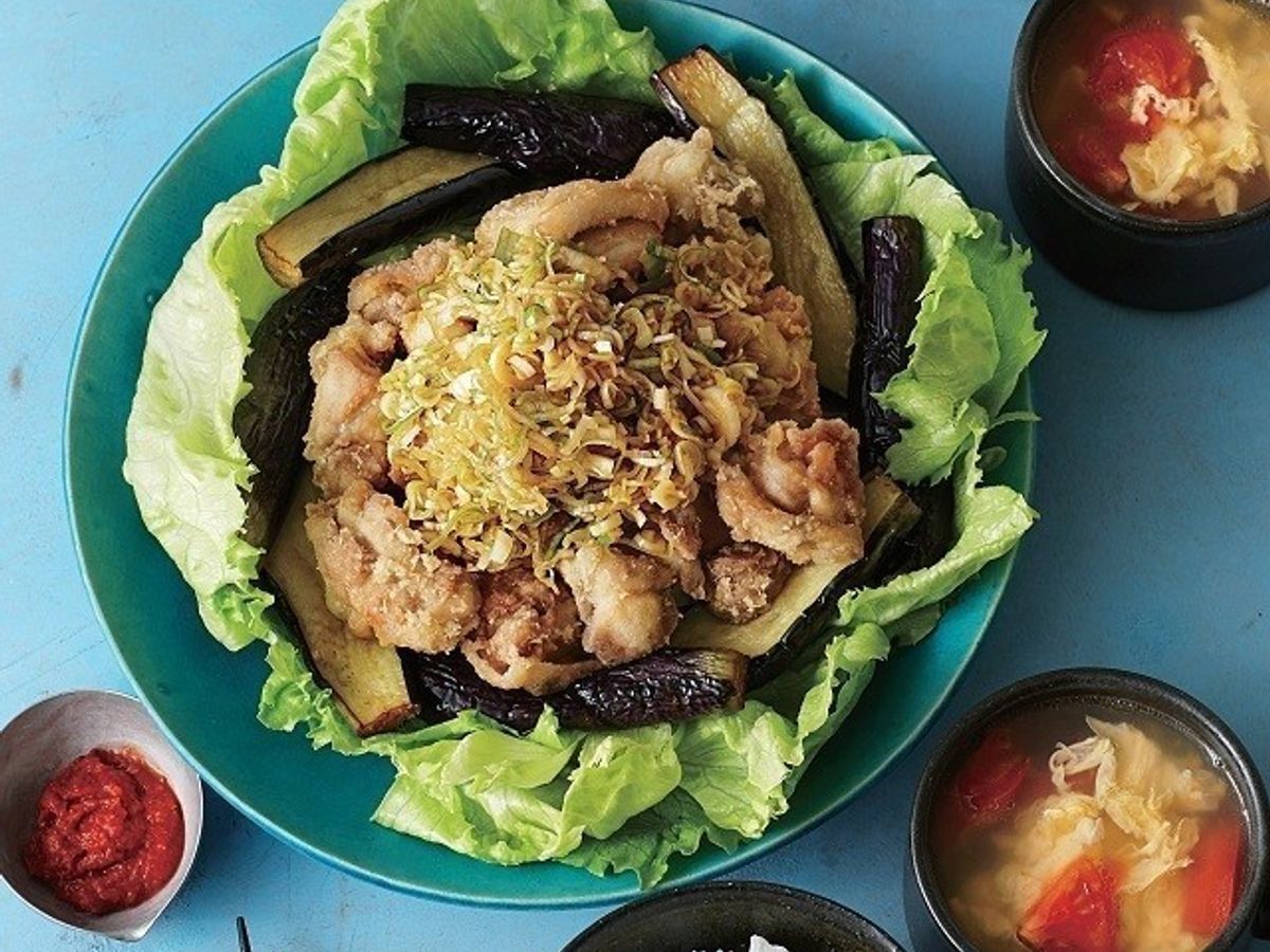 まずスープの鍋を火にかけてから材料を切ります。スープを仕上げてから、鶏肉、なすの順に揚げ、ねぎソースを作って、盛りつければ、一気に2 品でき上がり!