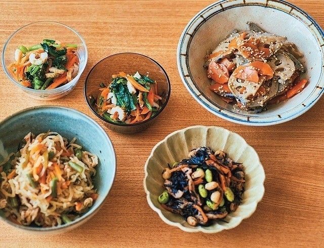 きんぴらとひじき煮、おひたし、切り干し大根。にんじんや大豆、枝豆を追加することで、栄養も彩りもコスパよくアップ!