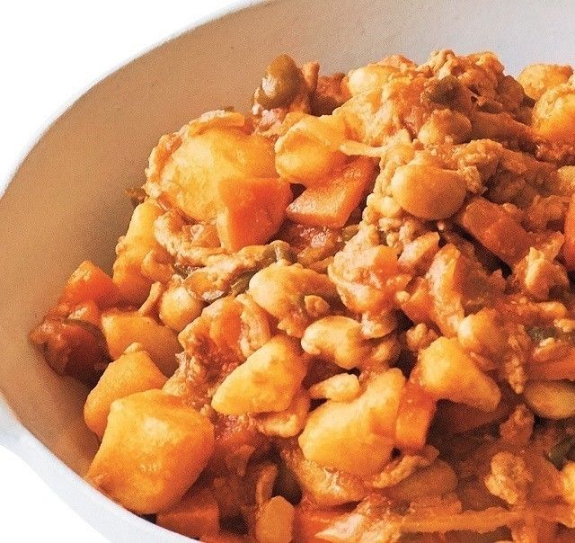 加熱すると少し硬くなる豚こまには、ホクホク食感の水煮大豆が相性抜群。安定価格のにん・玉・じゃがで栄養バランスもアップ。ケチャップに砂糖をたすと即、子ども好みの味に!