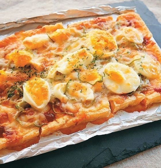 油揚げにケチャップを塗り、ピーマン、ゆで卵、溶けるチーズなどをトッピング。オーブントースターで焼けば完成。(まーこさん)