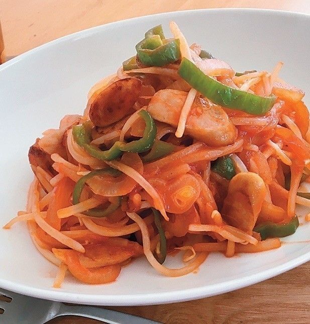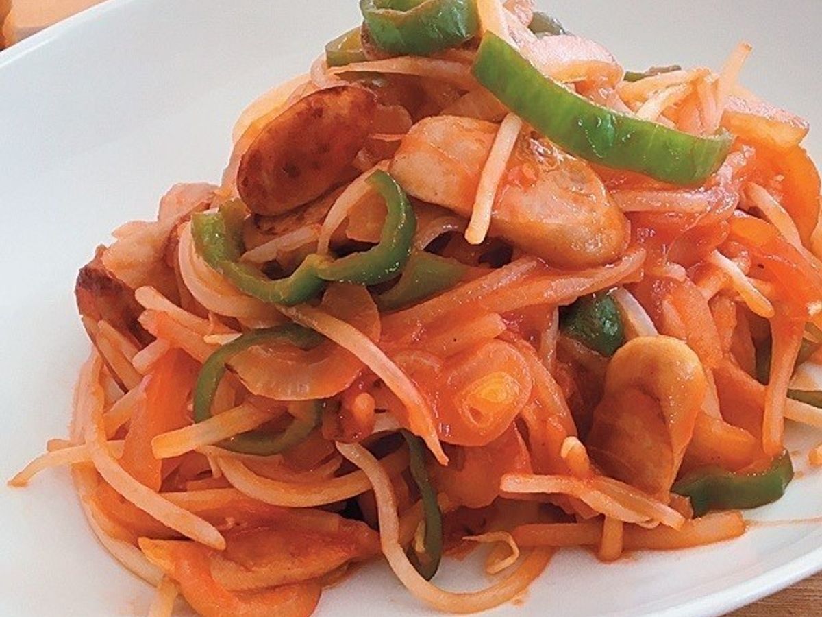もやし、ウインナー、玉ねぎ、ピーマンをケチャップで炒めるだけ。もやしをしんなりするまで炒めるのがコツ。(にいかわさん)