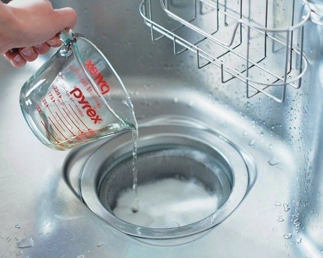 鍋で酢を沸騰しない程度に温める。排水口に重曹をふりかけ、温めた酢をかけて発泡させ、5分おく。上から熱湯をかけて洗い流す。一度で取れない場合は、1、2回繰り返す。