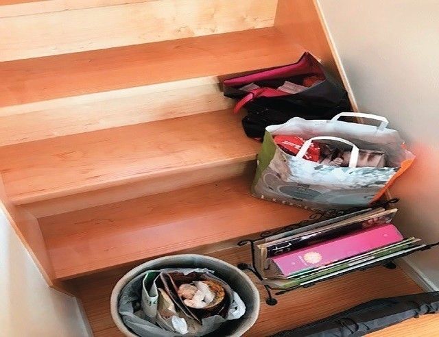 「今だけ」と思っても階段に物を置くのは危ないのでNG。ちょい置き品の片づけを後回しにすると、忘れてそのまま放置しがちなので、その都度しまうのがベスト!それが大変なら一時置き場を設けて、その日中に戻すことを習慣に。