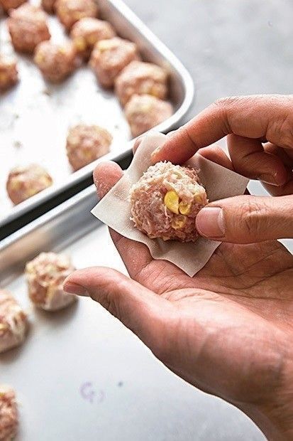 ボウルにひき肉、Aを入れ、粘りが出るまで手で混ぜる。玉ねぎ、とうもろこしを加えてさっと混ぜる。28等分にして丸め、シュウマイの皮で包む。