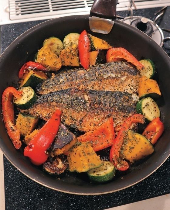 1.フライパンにオリーブ油大4を入れ、塩さば2切れを皮目を下にして入れる。かぼちゃ(一口大)⅛個分、赤パプリカ(くし形)½個分、ズッキーニ(輪切り)½本をぎっしりと並べる。