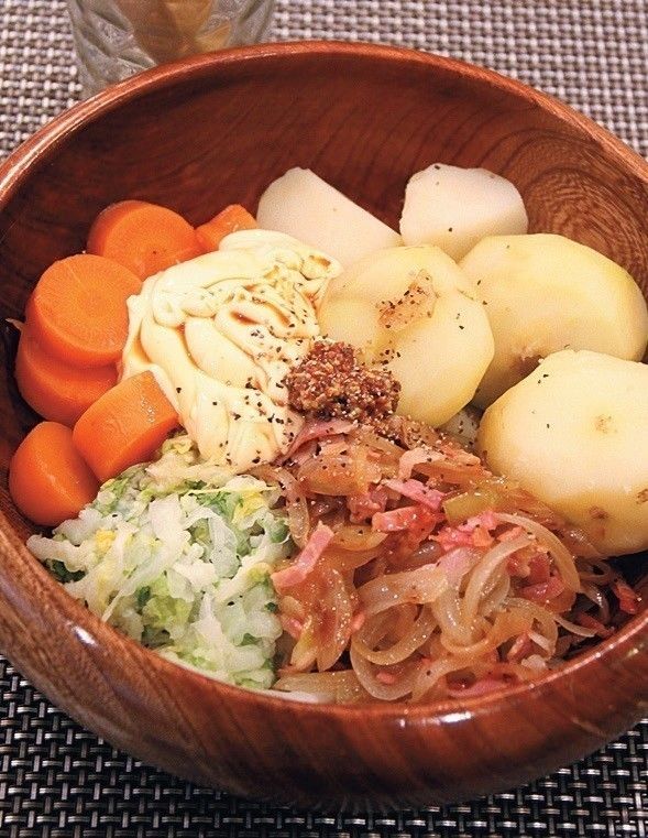 1.じゃがいも3個、にんじん(輪切り)½本、キャベツ(ざく切り)⅛個分は、レンジで柔らかくなるまで加熱する。キャベツは、水けを絞る。