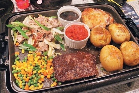 3. 鶏肉、ハンバーグは、片面8分、裏返して3~4分ほど焼く。豚肉は、焼き色がついたら、鶏ガラスープの素小½、塩、うま味調味料各少々をふりかけて混ぜる。じゃがいもにバター適量をのせる。
