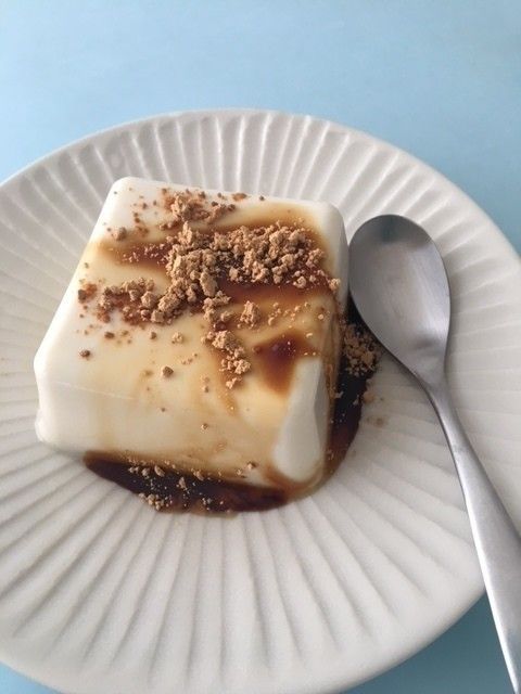 絹ごし豆腐の水けを軽くきり、黒みつをかけて、きなこをふる。