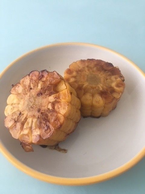 ゆでたとうもろこしを厚さ3㎝に切って焼き、しょうゆとみりんをからめる。