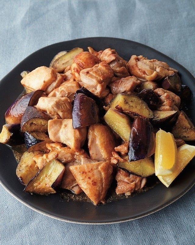 フライパンを中火で熱し、鶏肉を焼き、色が変わってきたらいったん取り出し、なすを焼く。なすに油が回ったら塩、こしょう各少々をふり、肉を戻し、全体に火が通るまで焼く。器に盛り、好みでくし形切りにしたレモン適量を添える。