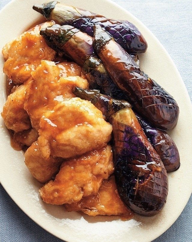 鶏胸肉2枚はそぎ切りにして水大3をもみ込んで片栗粉適量をまぶす。なす4個は縦半分に切り、皮に格子状の切り目を入れる。