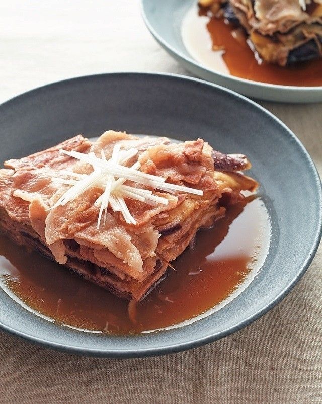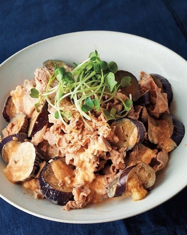なす4個は厚さ1㎝の輪切りにし、塩少々を加えた湯でゆでて取り出す。同じ湯で豚しゃぶしゃぶ用肉500gもゆで、火が通ったら水にさらす。