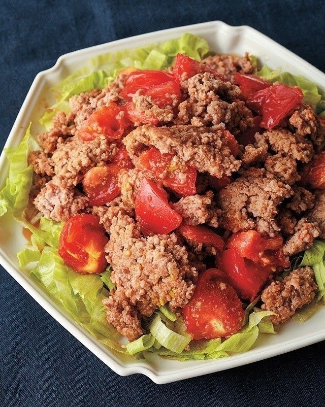 フライパンにサラダ油大1を中火で熱し、豚ひき肉500gを入れてへらで押しつけるように焼き、粗くほぐす。トマトを加えてさっと炒め合わせ、ポン酢しょうゆ大4、白すりごま大2をからめる。あれば細切りにしたレタス適量を器に敷いて盛る。