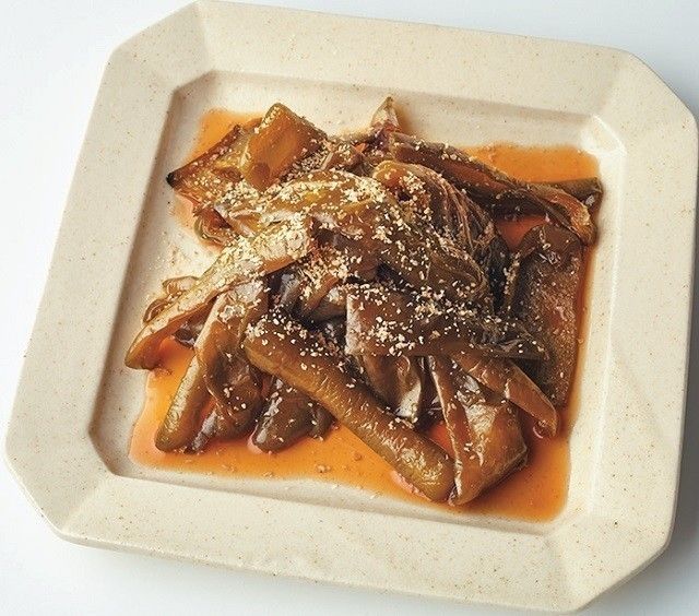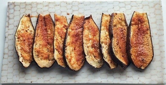 なす2個はへたを取って、縦に厚さ7~8㎜に切ってアルミホイルに並べる。焼き肉のたれ大1、粉チーズ大1½ を均等にふり、オーブントースターで10分焼く。