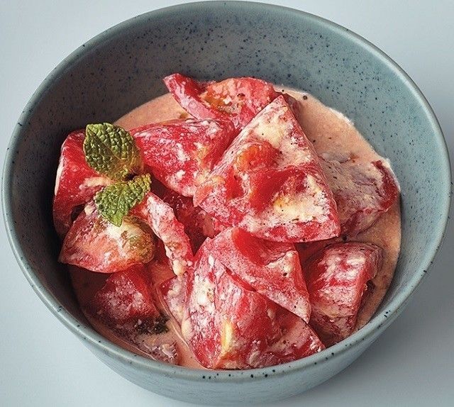 トマト2個をざく切りにし、マヨネーズ、プレーンヨーグルト各小2、塩、粗びき黒こしょう各少々を混ぜる。好みでミントを添える。
