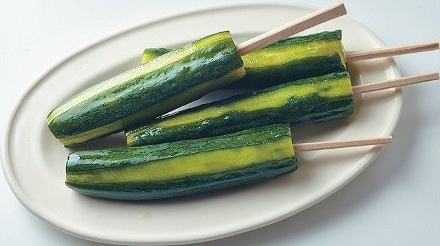 きゅうり2本はピーラーでしま目に皮をむく。長さを半分に切り、塩小½ をすりつけて2分おく。水けを拭いてめんつゆ大2に漬け、10分以上冷蔵室で冷やし、半分に折った割り箸を刺す。