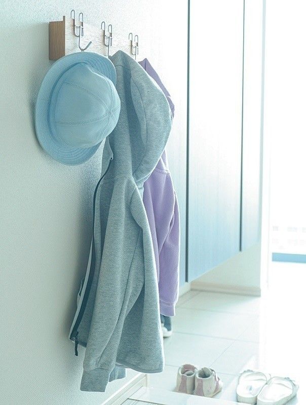 玄関に上着や帽子が掛けられるフックを設置。ポイントは、子どもの手が届く高さにしておくこと。