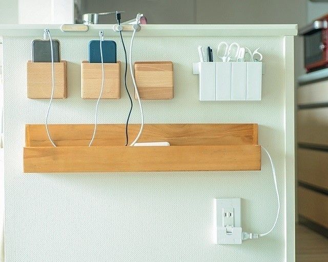 つめ切りや体温計、はさみ、スマホの充電器など、家族がよく使うものは目につく場所に一括収納。キッチンわきならリビングからの死角になるので、部屋がごちゃついて見えません。