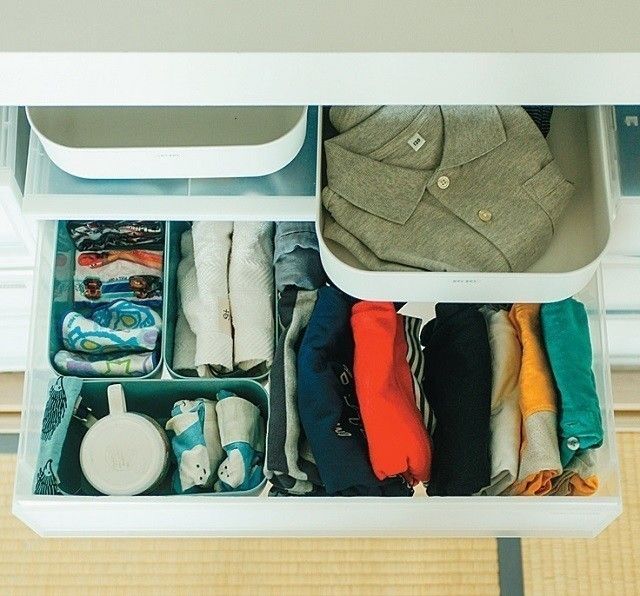 保育園に着ていく服や持っていくものは、長男が前日に自分でセットする仕組みに。1つの引き出しにまとめて、上からひと目でわかるようにしておけば、小さな子どもでも迷わず取り出せます。