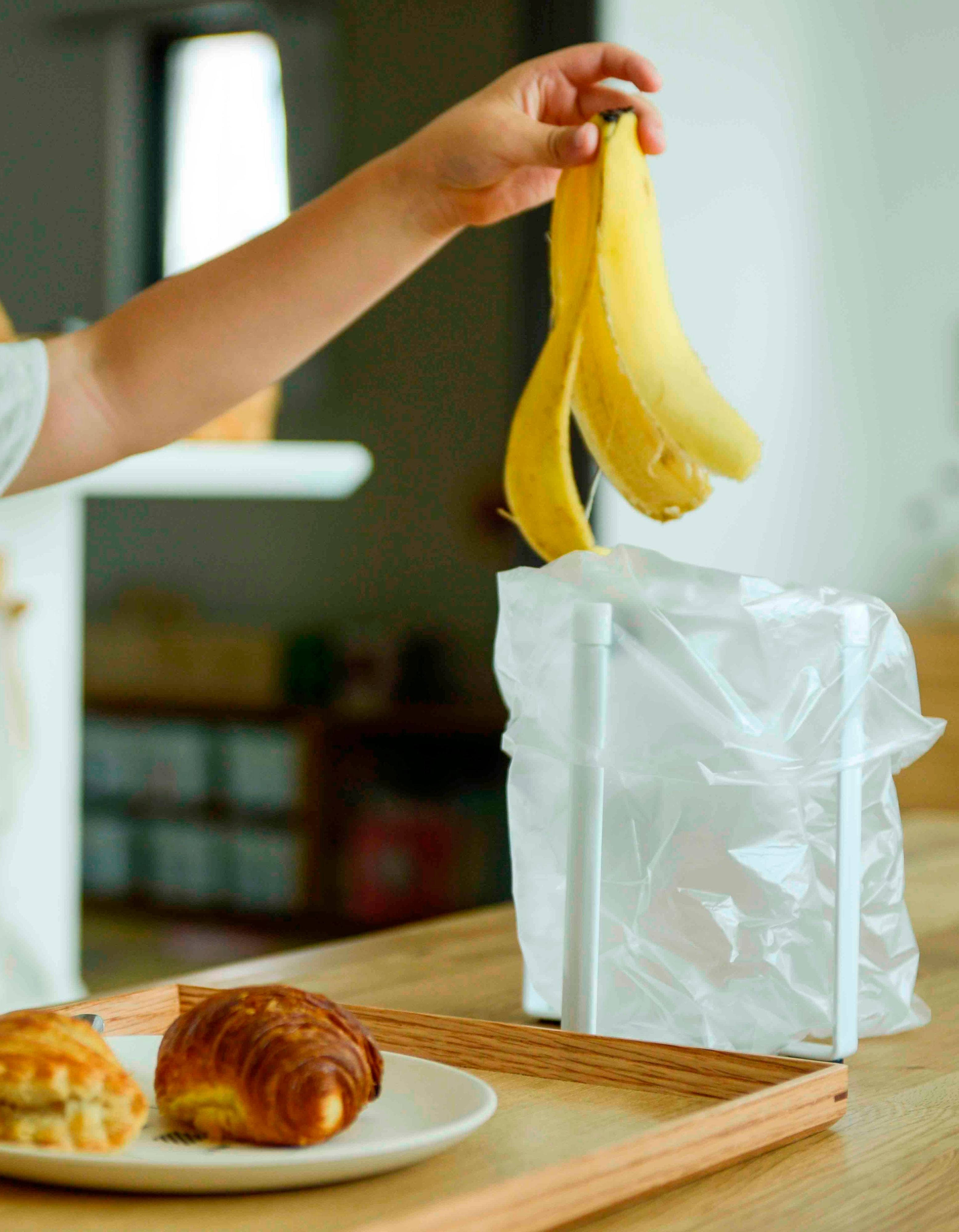 折りたたみ式のグラスホルダーにポリ袋をセットして、食卓に。いちいち席を立たなくても、食事中に出たゴミをその場ですぐ捨てられるので、食後の片づけがラクに。