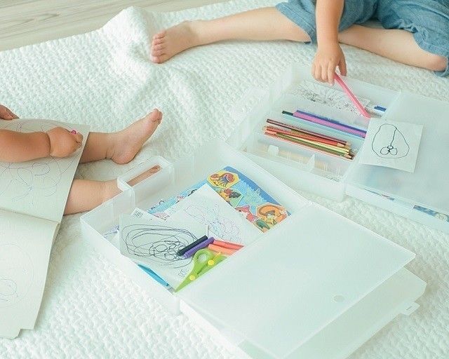 バラバラになりがちなペンや落書き帳の収納には、無印良品の持ち手つきケースを活用。遊ぶときはケースごと持ち出せ、フタを閉めれば一瞬で片づきます。1人1つなので、兄妹ゲンカにならないのも◎。