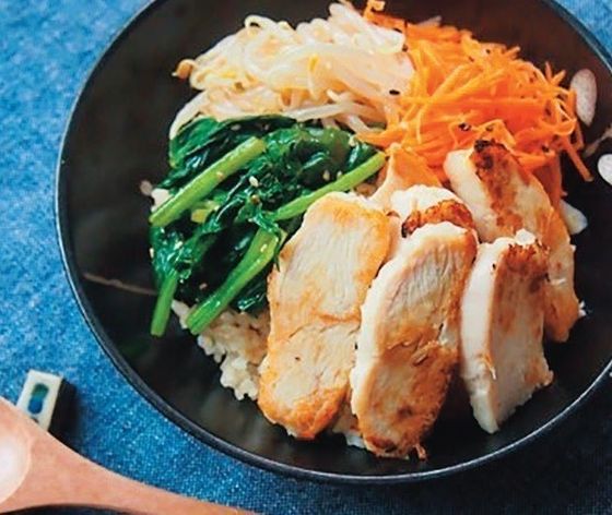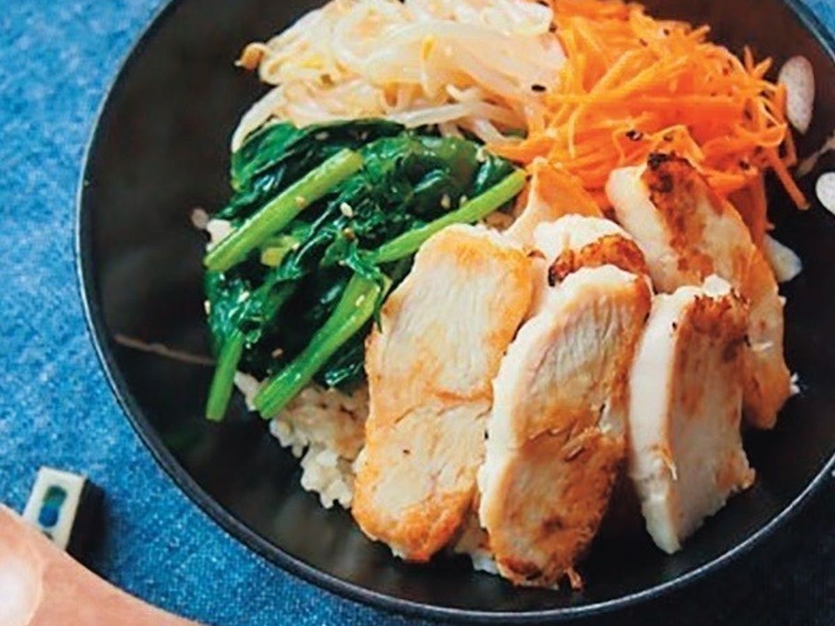 サラダチキンはごま油でサッと焦げ目をつけて、ナムルと一緒にご飯にドン!塩味がしっかりついているので、味つけいらず。