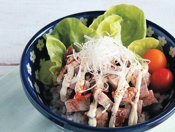 レタス、煮豚、しらがねぎをご飯にのせてマヨネーズをかければ、こってり系のどんぶりに。たれも残さず使います。麺類とも合う!
