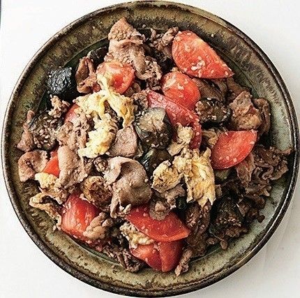 2のフライパンに豚肉を入れ、強火で焼く。ひっくり返したら肉を少し寄せてなすを入れ、なすに油を吸わせるようにして炒める。全体に火が通ったら、Aを加えてからめ、2の卵を戻し、トマトを加えてさっと炒め合わせる。