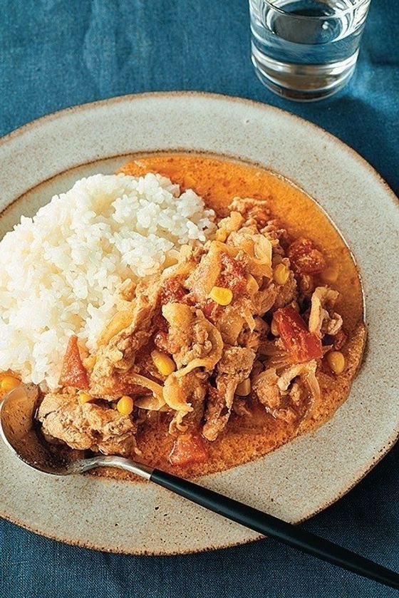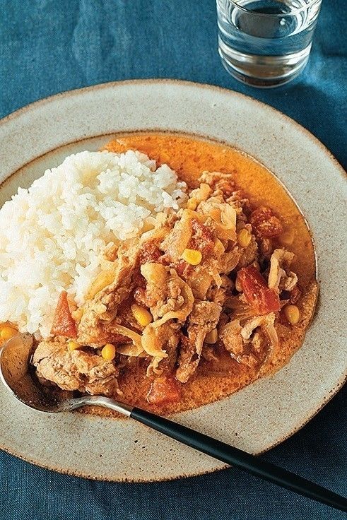 2.鍋に湯200mlを沸かし、凍った豚肉、トマト、玉ねぎ、コーンを入れて強火にかける。