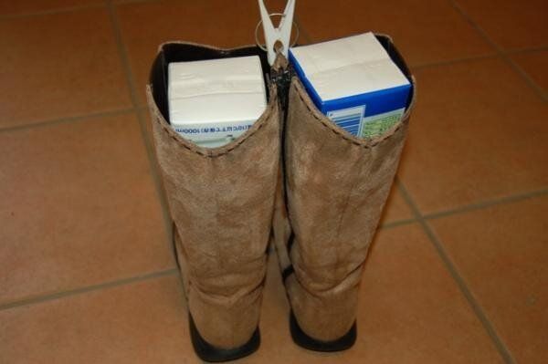 こちらは、よく洗って乾かした牛乳パックや空のティッシュ箱をブーツキーパーとして代用するアイデア。それに加えて、しけって使えなくなったインスタントコーヒーをボロ布やガーゼに包んで入れると、臭い&湿気取りもできるそうです。臭い対策がコスト0円でできちゃうのはうれしいですよね!