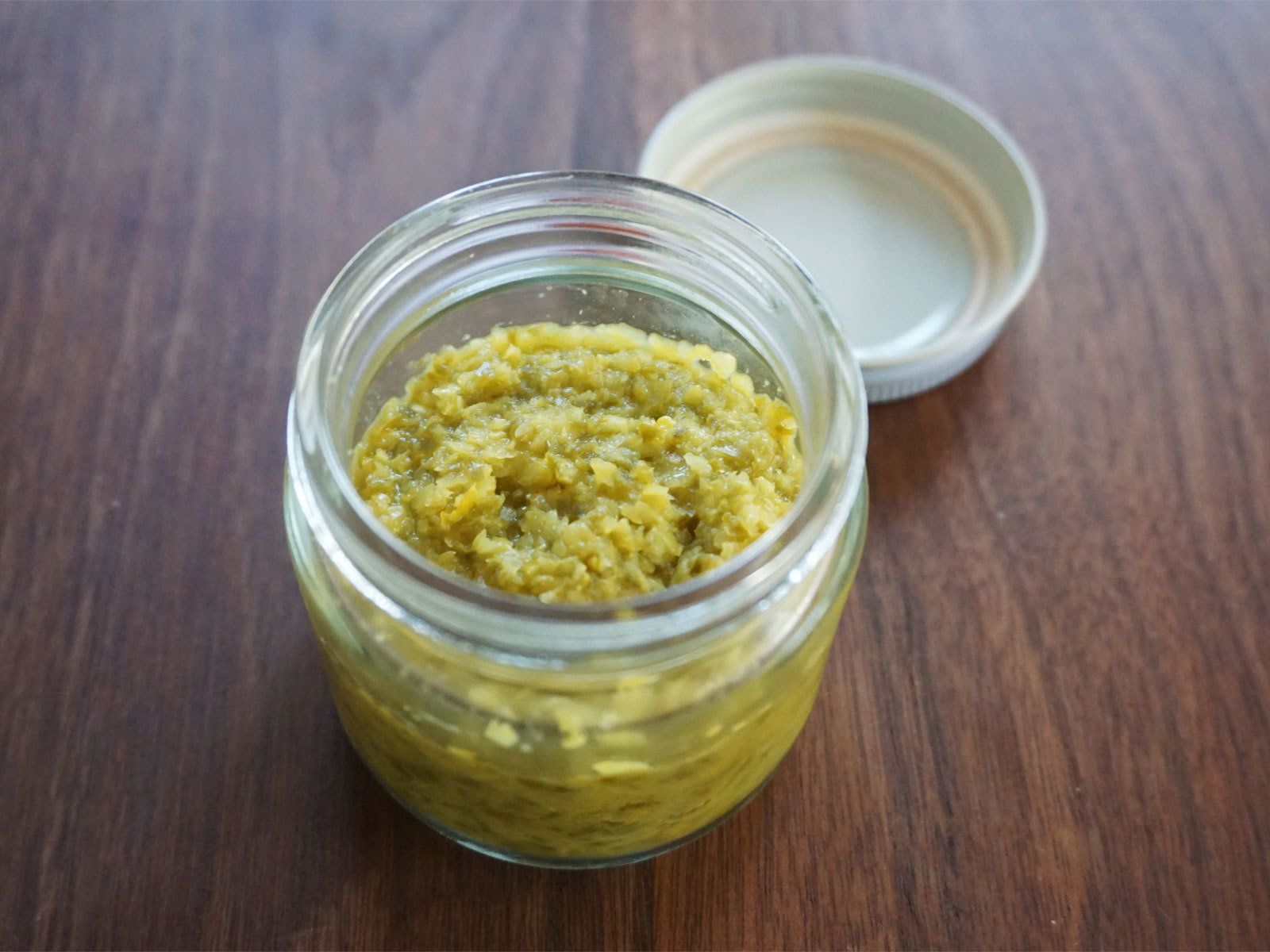 ゆず(5個)は皮をむき、青唐辛子(5本)はへたをとって、ざく切りにします。ゆずの白い部分は苦みがあるので、できるだけ薄めにむくのがポイント。ゆずの皮と青唐辛子、塩(10g)をフードプロセッサーに入れて、混ぜ合わせます。消毒した瓶に入れて、冷蔵庫で1週間ほど熟成させれば、でき上がり。できたてすぐは塩けが立って塩辛く感じるかもしれませんが、しばらくおくと、なじんで落ち着きます。