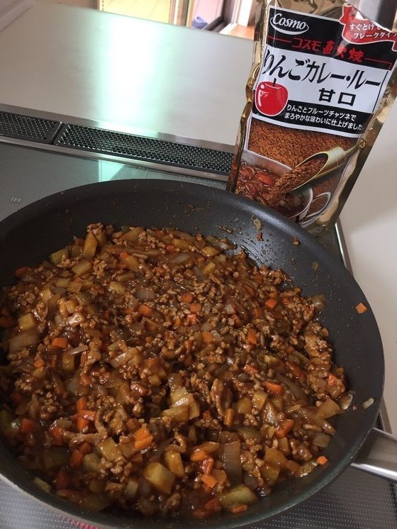 ドライカレーの方が野菜も多くとれると考えているchigさん。冷蔵庫の野菜を細かく刻んで、レンジでチンしたものをひき肉といっしょに炒めます。水とフレークタイプのカレールーを入れて煮れば完成!15分もあればできあがるそうですよ。