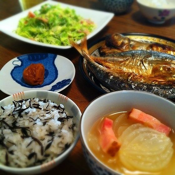 ごはんを炊いている間に、新玉ねぎのスープや焼き魚を15分で完成させたのは野口ゆかさん。冷凍保存しておいた、塩をふった千切りキャベツを使ってコールスローサラダも作りました。ひじきごはんは、炊いたごはんにまぜたのは、作り置きしておいたひじきの炒め煮。下ごしらえの食材が大活躍していますね。