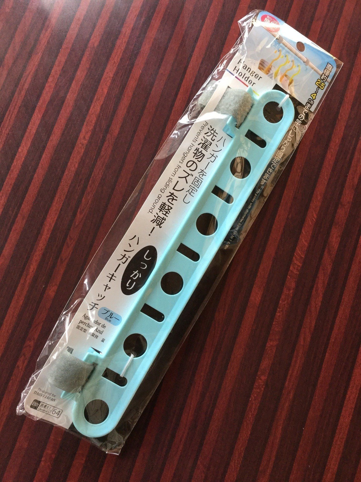 風の強い地域に住むごえもんママさんがとても役立っているというグッズは、100円ショップの「ハンガーキャッチ」。商品についているマジックテープをもの干し竿に巻いて固定し、穴にハンガーをかけて使います。間隔をあけて干せるため洗濯もの同士がくっつかず、風の通りもよくて乾くのが早いそうです。