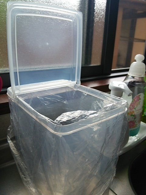 そこで、100円ショップで売っていた、フタが立つ保存容器に変更。片手でもフタの開閉が簡単に行え、閉めておけばゴミの臭いが防げるだけでなく、見た目もスッキリとします。