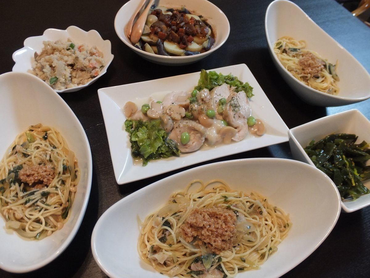 「えのきと大根葉と豚肉の和風パスタ納豆のせ」や「じゃがいもと茄子のグラタン」など、見た目にも手の込んだ料理計5品を、なんと20分で作ったmakanaさん!味つけした野菜を先にレンジで蒸しておいたり、前日の残りのビーフシチューを使ってリメイク料理をつくったりすることで、これだけの豪華な料理を時短で作れているそうです。