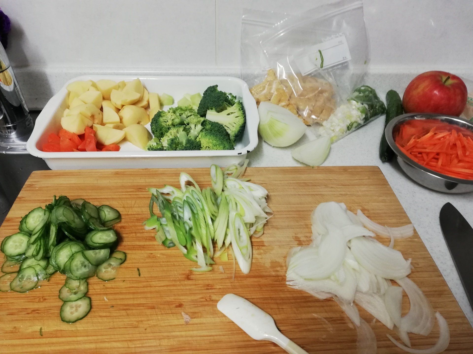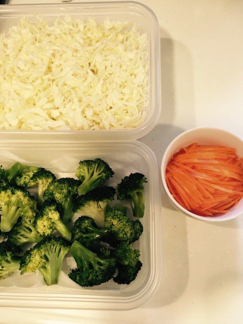 chiharuさんは、”ながら作業”で常備菜をつくるようにしています。この日のメニューは、エビカツと、サイドメニューにキャベツの千切りとニンジンラペと茹でブロッコリー。サイドメニューはどれも多めにカットして常備菜として保存し、翌日の朝食用に利用しました。