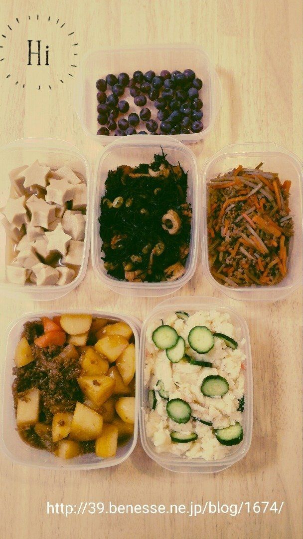 ひじき煮やきんぴらごぼう、かぼちゃの煮つけなどの定番料理を常備菜にしているNagomyさん。この日は、それにプラスしてぶどう、高野豆腐の含め煮、味噌バター肉じゃがとポテトサラダもつくりました。毎日同じものを食べている感覚にならないように、隔週で常備菜づくりをするように工夫しているのだそう。