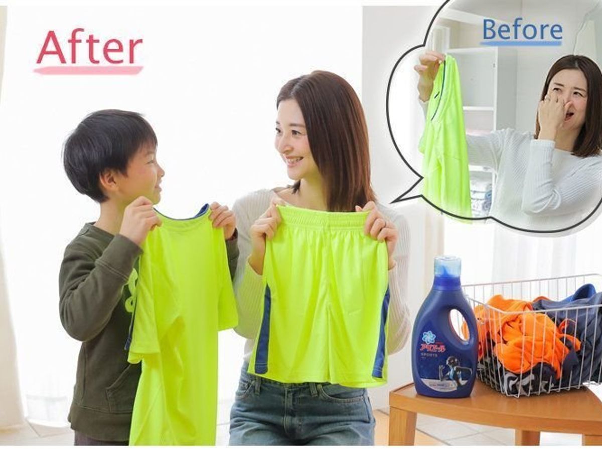町田さんが体験して驚いた『アリエール プラチナスポーツ』は、スポーツウェアをはじめ、運動着やパパの作業着などに使われる合成繊維に付着したしつこい汚れを、新開発の“プラチナ消臭洗浄テクノロジー”により強力洗浄。さらに、着ている間も続く消臭効果※1を実現したアリエール史上最強※2の画期的な衣料用洗剤。