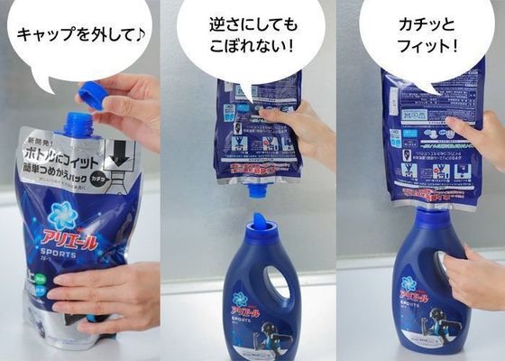 さらに町田さんがびっくりしたのが、逆さにしても中身が出ない! ハンズフリーで詰め替えができる新しい詰め替え容器。「詰め替えって面倒だし、こぼしてしまう心配があるので、緊張感がありますよね。『アリエール プラチナスポーツ』の詰め替えは、本体ボトルの注ぎ口にフィットするまで逆さにしても中身が出ないんです! 本当にハンズフリーであっという間にオシマイ。気持ちよくて、次の詰め替えが楽しみになります(笑)」
