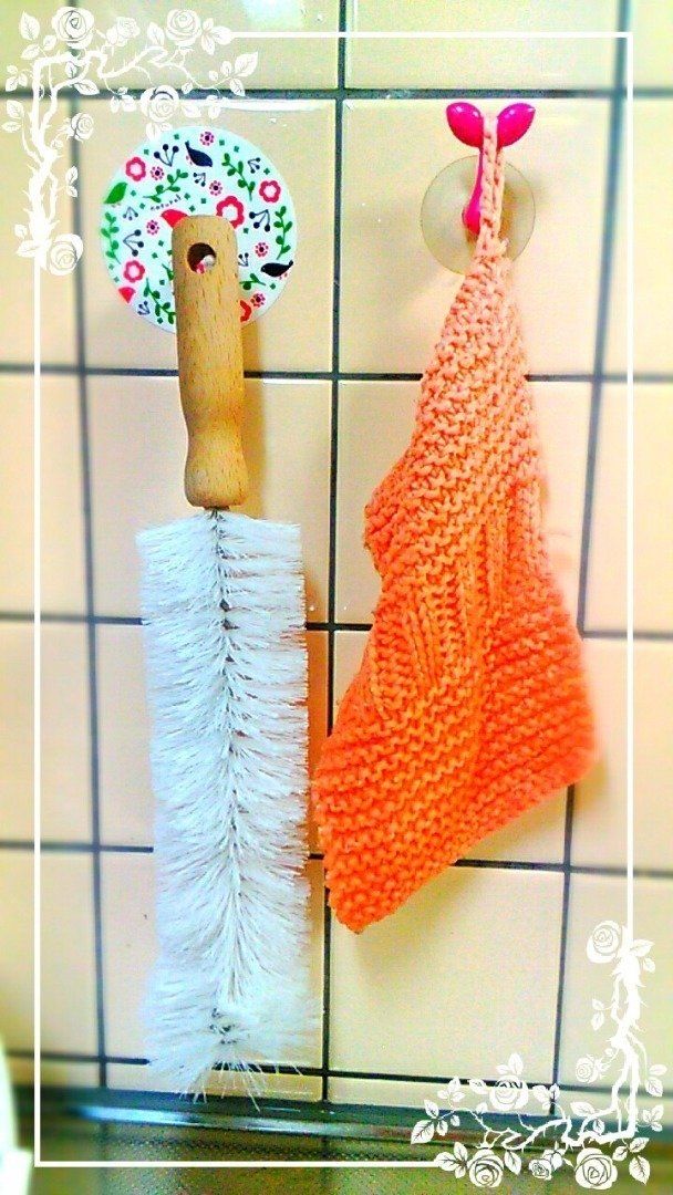 堀江麻衣さんは、食器洗いに手づくりの「エコたわし」を活用しています。大判なので、フライパンなどの洗い物にも使いやすく、食器の細かいところまで洗えるのだそう。週に何度か、ふきんと一緒に漂白し、丁寧に使用しています。つるして保管することで、普通のスポンジよりも乾きが早いそうです。