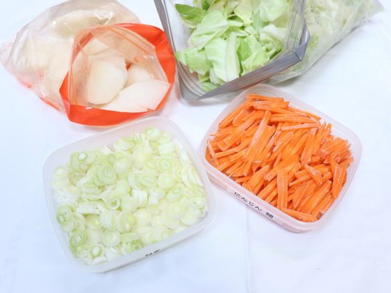 食費を抑えるには、食品ロスを減らすことも重要。海老原葉月さんは、使い切れない葉物野菜やにんじん、キノコなどを夕ごはん準備のついでに切り、冷凍カット野菜をつくっています。冷凍すると火の通りも早くなるので、料理の時短になります!常備菜だと食べきれないという人には、日持ちする冷凍保存がおすすめですよ。
