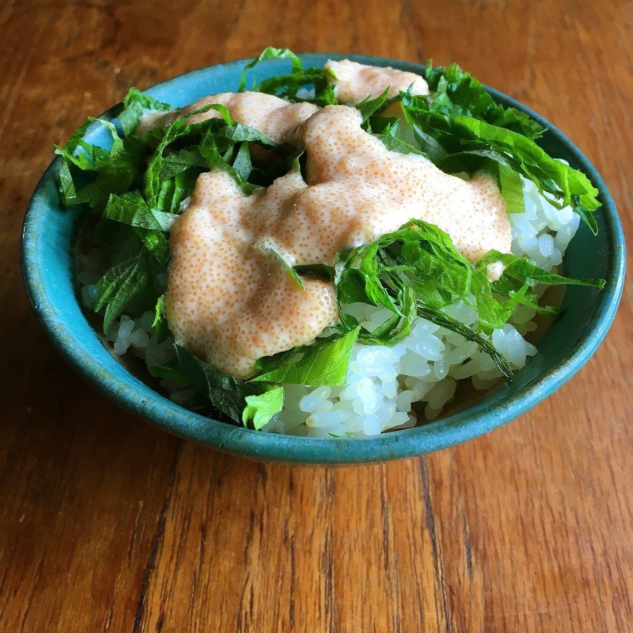 お弁当の残りのおかずがあるときには、小さめの丼ぶりをつくるという野口ゆかさんの小丼ぶりレシピの1つが、ご飯の上にしその千切り&明太マヨ和えを乗せたもの。食材や調理のシンプルさが節約や後片づけの楽さにつながっているところが、とても気に入っているそうです。
